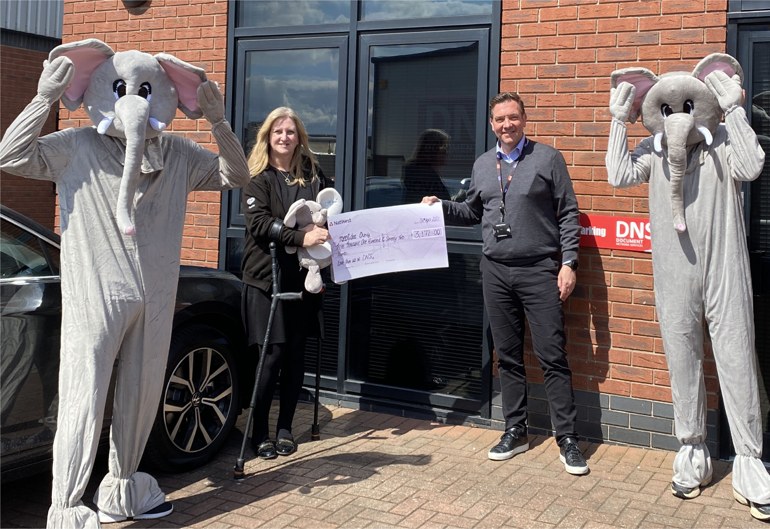 Maria receives the cheque from Darren Marsh with both Hope the elephant runners.