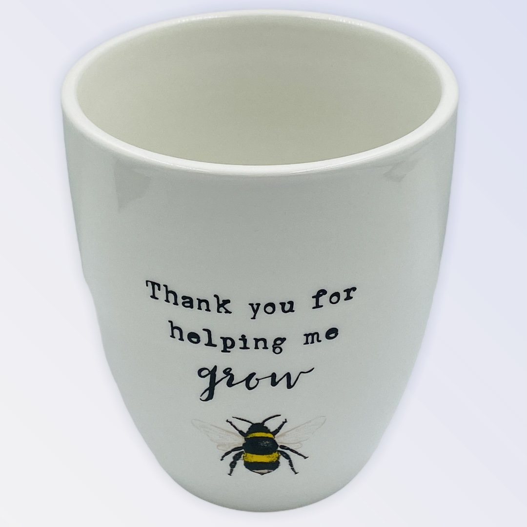This ceramic plant pot with its cute bee illustration and sweet ‘Thank you for helping me grow’ text.